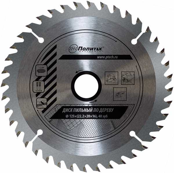 Диск пильный по дереву 125х22,2х20х16, 40 зубьев //Политех